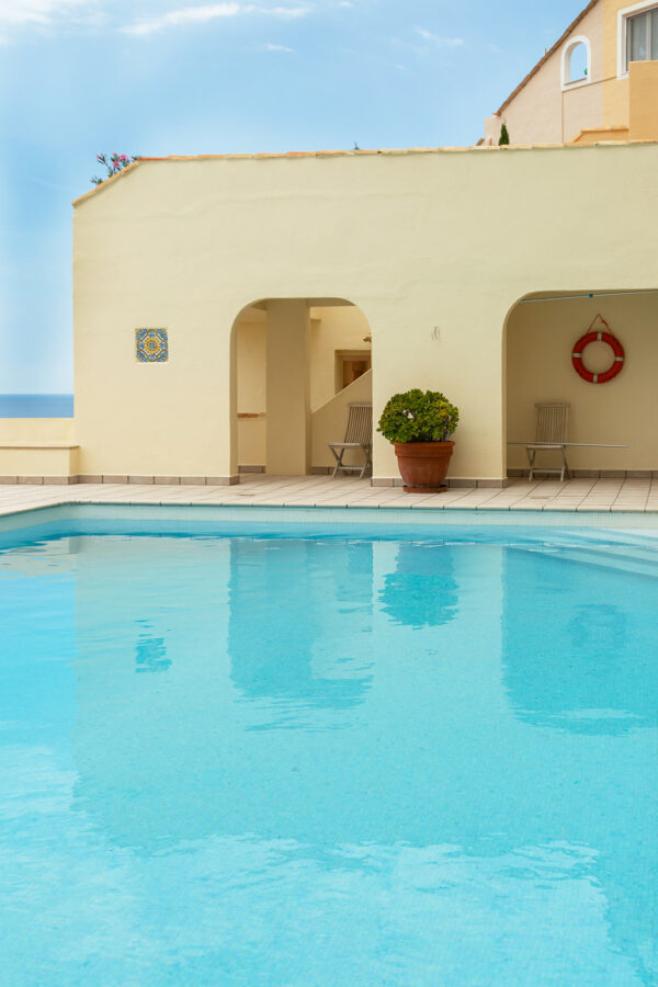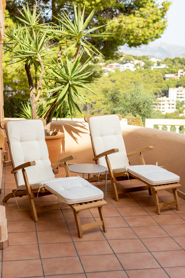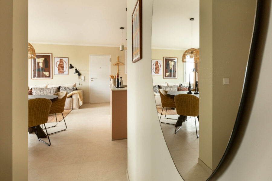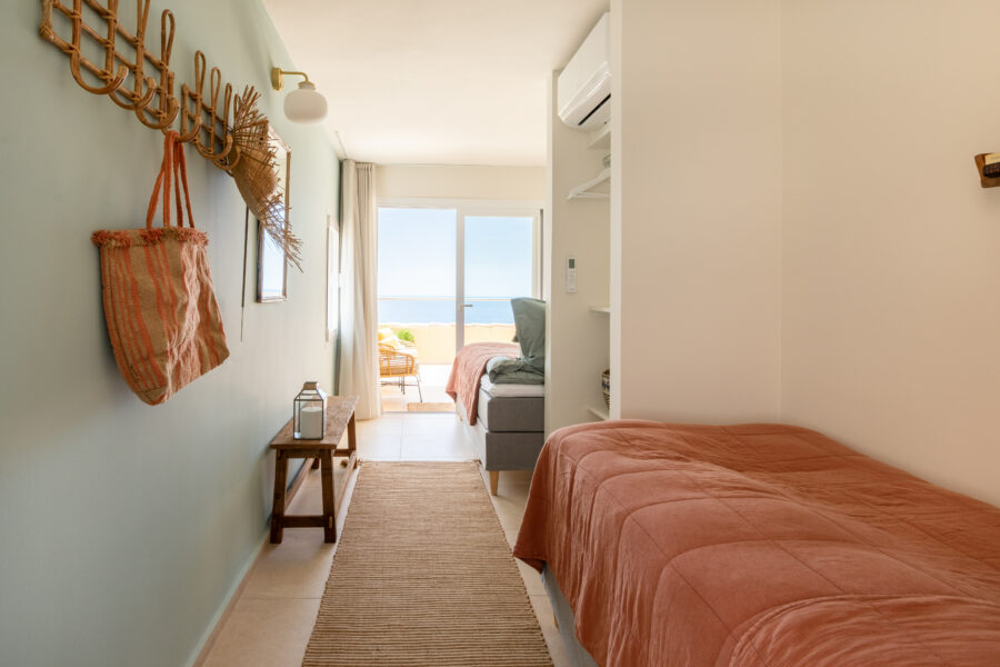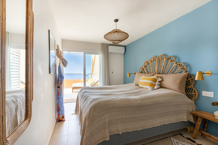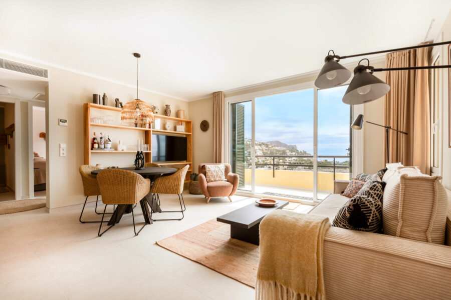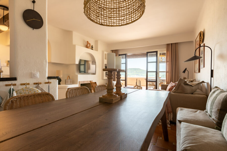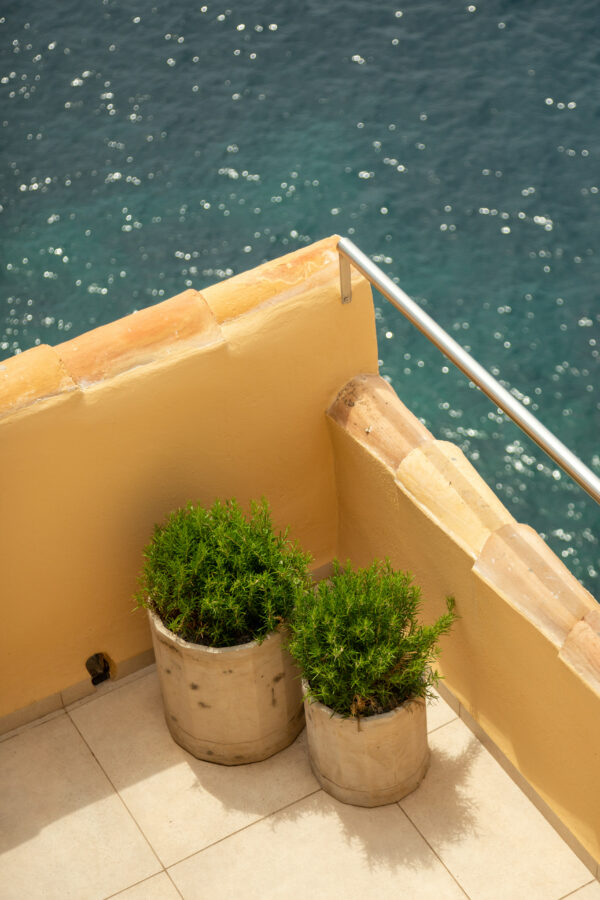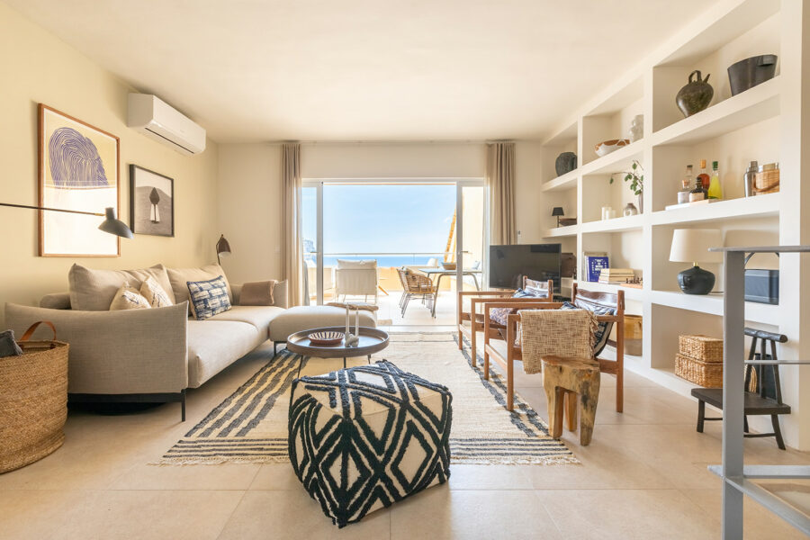 Lägenheten har en underbar sydvänd terrass med utsikt över det azurblå havet – en vy som tar andan ur de flesta. Havet, uteplatsen och bostaden smälter samman till en enastående helhetsupplevelse.