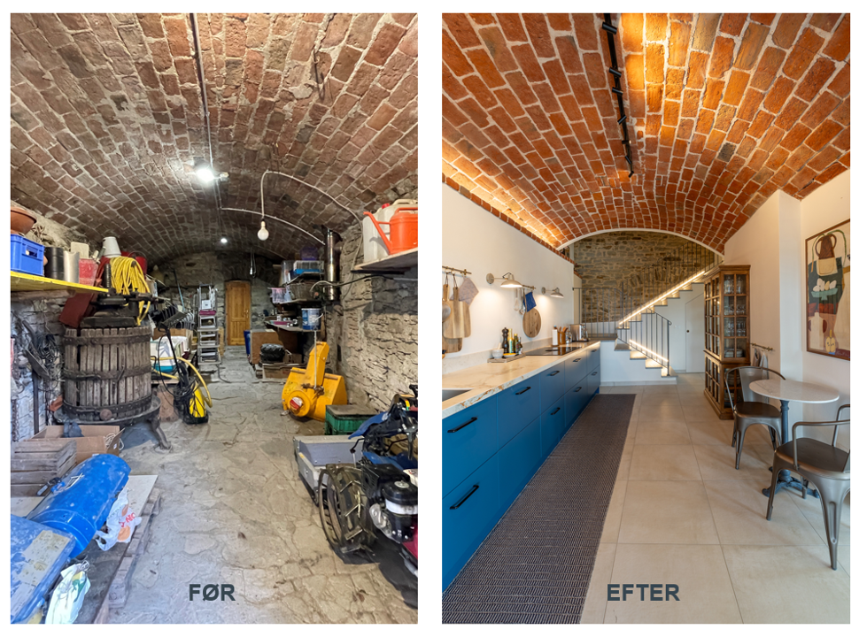 Nya öppningar har skapats mellan kök, matsal och vardagsrum – och på övervåningen har man byggt traditionella valvtak i återvunna handslagna tegelstenar, så kallade voltini, över 100 år gamla. Arkitekten Thomas Jensen berättar entusiastiskt att det är “de vackraste stenar jag någonsin sett”.